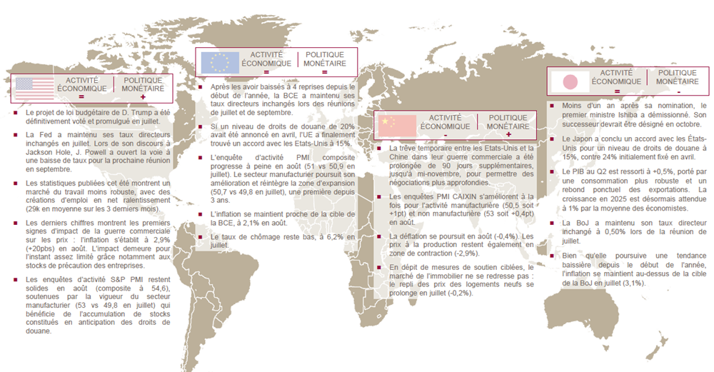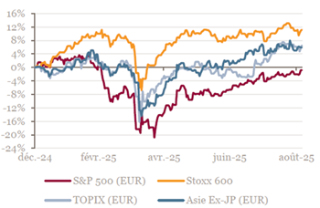 Cet été, les marchés actions ont poursuivi leur rebond dans l’ensemble des zones, à l’exception de l’Europe. Aux États-Unis, les principaux indices ont dépassé leurs plus hauts historiques, soutenus par les avancées sur la guerre commerciale, une orientation plus accommodante de la politique monétaire à Jackson Hole et de solides publications de résultats notamment des géants du secteur technologique. Les marchés actions japonais ont également atteint des sommets, bénéficiant de l’accord commercial signé avec les États-Unis et des flux étrangers porteurs. Le marché chinois a lui aussi poursuivi le rebond amorcé en début d’année grâce à un afflux de liquidités domestiques et le narratif technologique, ainsi que la stabilisation des tensions commerciales avec les États-Unis.