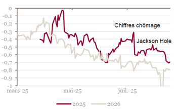 Sur le volet de la guerre commerciale, les droits de douane finaux ont été adoptés cet été et sont au global plus bas que ceux annoncés le 2 avril. En parallèle, une cour d’appel fédérale a confirmé l’illégalité de l’usage de l’IEEPA pour justifier les droits de douane : une décision finale devrait être rendue d’ici la fin de l’année par la Cour Suprême. Si certains signaux laissent penser que les effets de la guerre commerciale commencent à se matérialiser (inflation à 2,9% en août, hausse des prix des biens sur les catégories les plus exposées aux droits de douane), l’impact reste pour l’instant limité : les entreprises n’ont pas encore répercuté la hausse des coûts sur leurs prix grâce notamment aux stocks de précaution. La composante « prix payés » de l’enquête PMI suggère néanmoins que les prix pourraient continuer de grimper dans les prochains mois. Pour le moment, l’économie américaine semble toujours résiliente, mais les données sont encore perturbées par l’impact du commerce extérieur : la croissance du PIB au T2 a fortement rebondi (+3,3% sur le trimestre) grâce à la normalisation de la balance commerciale, les enquêtes d’activité restent solides essentiellement grâce à la vigueur du secteur manufacturier où les entreprises ont accumulé des stocks en amont des droits de douane. Quant à la consommation des ménages, les premiers signes de ralentissement apparaissent sur les dépenses en services discrétionnaires, dans un environnement où la confiance des consommateurs est faible et où les conditions de crédits toujours restrictives freinent la distribution de prêts. Du côté de l’emploi, les derniers chiffres publiés et la révision des précédents font état d’un marché du travail moins robuste que prévu, avec des créations d’emploi en net ralentissement (29k en moyenne sur les 3 derniers mois). D’autres indicateurs signalent une dégradation du marché du travail, mais ces tendances ne sont pas récentes. Cette situation du marché du travail a été mise en avant par J. Powell à Jackson Hole pour ouvrir la voie à une baisse des taux lors de la réunion de la Fed de septembre. Trois baisses de taux sont désormais anticipées par le marché d’ici la fin de l’année.