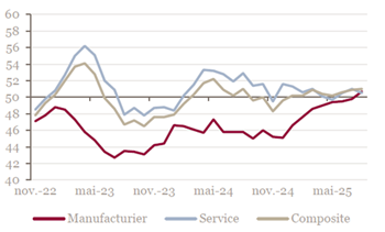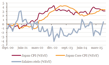 La seconde estimation du PIB du T2 montre une économie japonaise bien orientée (+0,5% sur le trimestre), portée par une consommation privée plus robuste et un rebond des exportations. De retour en territoire positif, les salaires réels devraient apporter un soutien à la consommation des ménages. Les économistes ont revu à la hausse leurs prévisions de croissance pour 2025 à 1%, près du double du potentiel de croissance du pays. Suite à la démission du premier ministre Ishiba début septembre, le Japon est entré dans une phase d’instabilité politique, avec des trajectoires budgétaires dépendantes de son successeur, entre maintien d’une discipline budgétaire ou potentielle dérive. Une élection interne du Parti libéral-démocrate en octobre désignera le nouveau premier ministre.