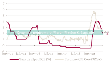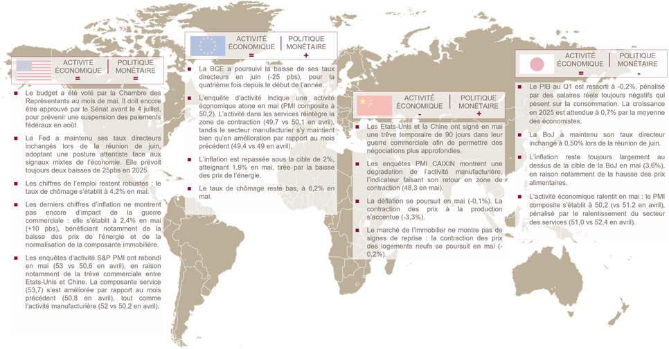 Dans ce contexte de désinflation et de croissance modérée, la BCE a poursuivi son cycle d’assouplissement monétaire en juin, en baissant ses taux directeurs de 25 pbs pour la quatrième fois depuis le début de l’année : ils se situent désormais dans la fourchette estimée du taux neutre. Si une baisse supplémentaire est anticipée d’ici la fin de l’année, C. Lagarde s’est montrée plus prudente sur la poursuite de l’assouplissement monétaire, en raison notamment des incertitudes liées aux droits de douane américains et à la relance budgétaire allemande.