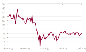 L’épisode de volatilité observé en avril, déclenché par les annonces de droits de douane généralisés aux États-Unis, a été rapidement absorbé par les marchés obligataires. Les taux évoluent désormais sans tendance marquée, et les spreads de crédit sont revenus à leurs niveaux précédents.