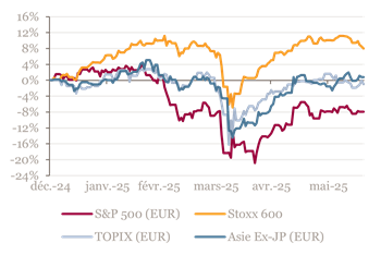 En Europe, les marchés actions ont eu tendance à légèrement rebaisser depuis la fin du mois de mai, après avoir fortement rebondi suite aux annonces de début avril. Si les actions européennes affichent toujours une performance positive depuis le début d’année (+8%) et supérieure à leurs homologues américaines, japonaises et chinoises exprimées en Euro, les attentes en termes de résultats des sociétés ont été très fortement révisées à la baisse pour 2025 : ils sont désormais attendus en hausse de 2% en Europe, contre 9 à 16% dans les autres zones.