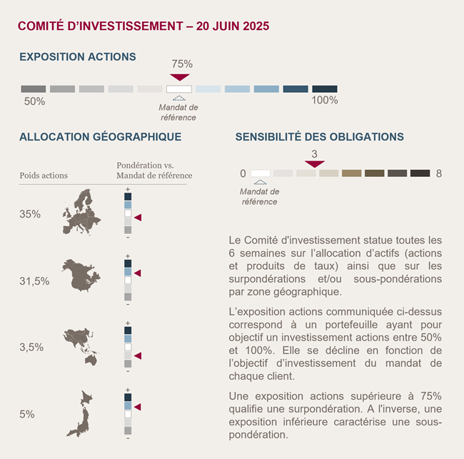 C’est pourquoi nous maintenons donc une exposition neutre aux actions, en ligne avec un environnement économique stabilisé mais avec une vigilance sur les développements géopolitiques.